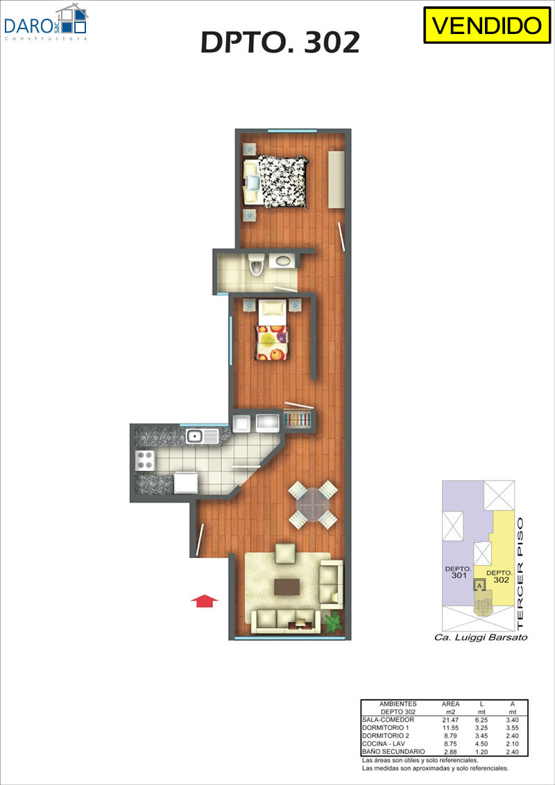 Departamento 302 del tercer piso con 68.15 m2. Consiste en sala-comedor, cocina-lavandería, 2 dormitorios, baño secundario.