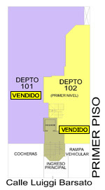 Departamento 102 del primer piso con 128.77 m2 de área techada (63.00 m2 en el primer nivel y 65.77 m2 en el segundo nivel) y 18.36 m2 de área libre, con dos niveles. El primer nivel consiste en sala-comedor con escalera, patio, cocina, patio-lavandería, cuarto de servicio, baño de servicio y el segundo nivel consiste en hall, baño secundario, 3 dormitorios, baño principal incluido en el dormitorio principal.