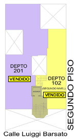 Departamento 201 del segundo piso con 116.58 m2. Consiste en sala-comedor, cocina, patio-lavandería, cuarto de servicio, baño de servicio, baño secundario, hall, 3 dormitorios, baño principal incluido en el dormitorio principal.