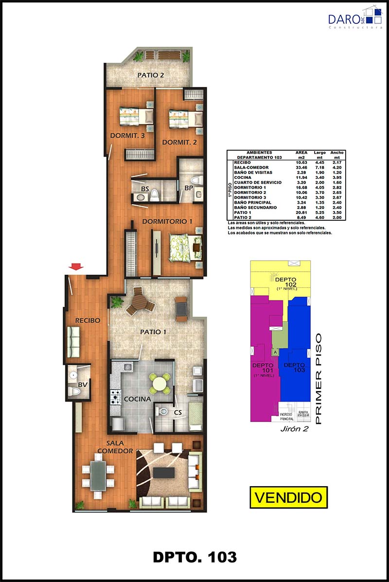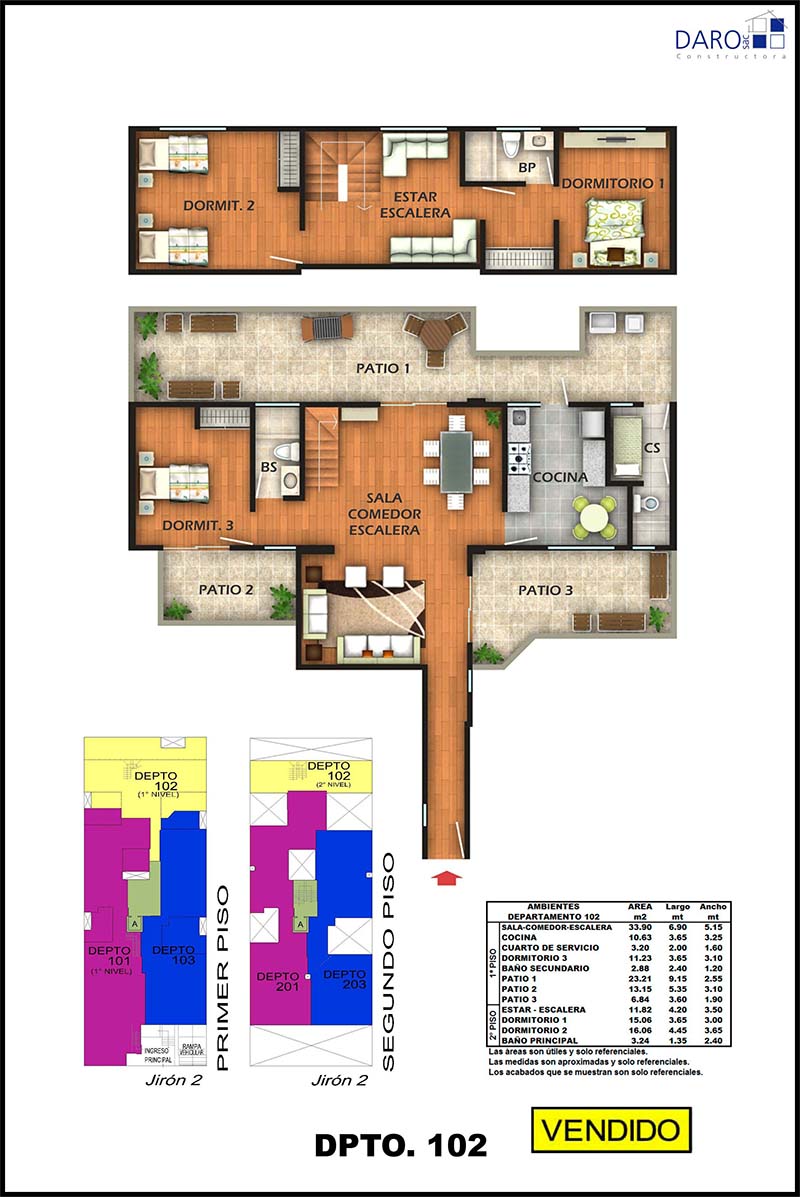 Departamento 101 del primer piso con 192.38 m2 de área techada (145.65 m2 en el primer nivel y 46.73 m2 en el segundo nivel) y 62.29 m2 de área libre (de ahí 25.00 m2 le corresponden a los estacionamientos), ocupa dos niveles. El primer nivel consiste en ingreso Independiente, recibo, sala-comedor, baño de visita, cocina, patio-lavandería, cuarto y baño de servicio, 3 dormitorios, baño principal incorporado en el dormitorio principal, baño secundario, 3 patios interiores, dos estacionamientos simples con ingreso vehicular directo, escalera de acceso al nivel inferior y el segundo nivel consiste en hall, estar-bar.