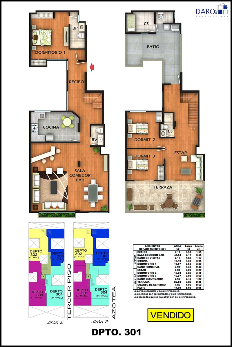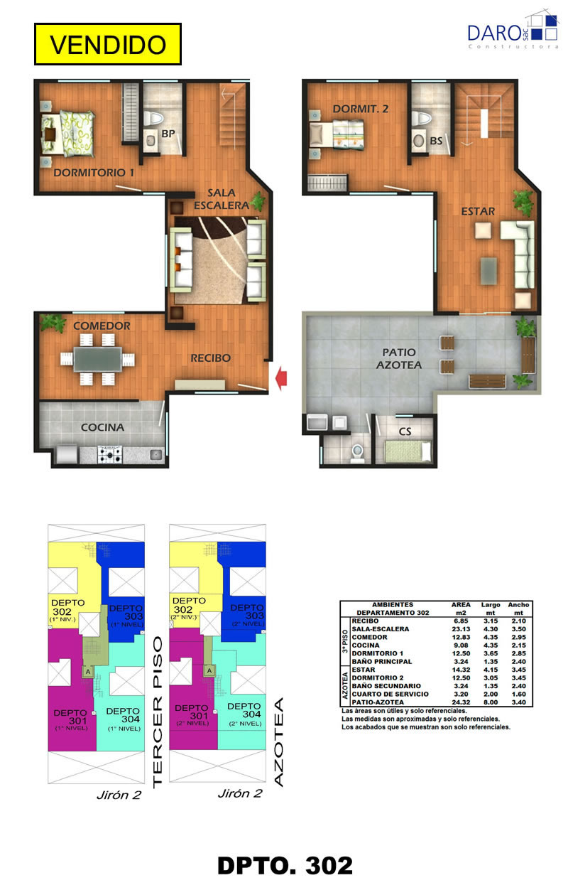 Departamento 302 del tercer piso con 132.76 m2 de área techada (79.53 m2 en el primer nivel y 53.23 m2 en el segundo nivel) y 26.36 m2 de área libre, ocupa dos niveles. El primer nivel consiste en recibo, sala, comedor, cocina, 1 dormitorio, baño secundario, escalera de acceso al segundo nivel y el segundo nivel consiste en estar, 1 dormitorio, baño secundario, patio-lavandería, cuarto y baño de servicio, patio-azotea.