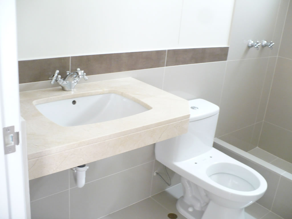 Todos los departamentos tienen dos baños principales, en los departamentos de tres dormitorios uno está incorporado en el dormitorio principal.