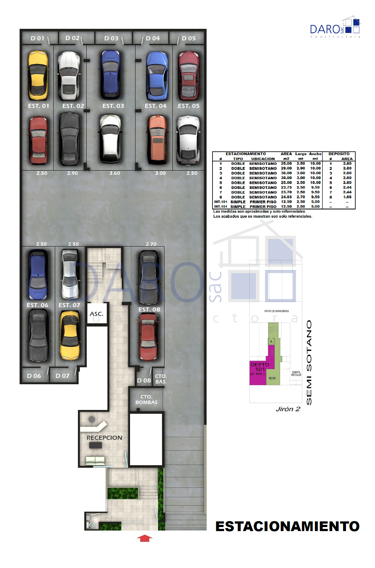 El semisótano consta de ocho estacionamientos dobles y ocho depósitos. Dentro del área del departamento 101 y con acceso directo de la avenida se tiene dos estacionamientos simples.