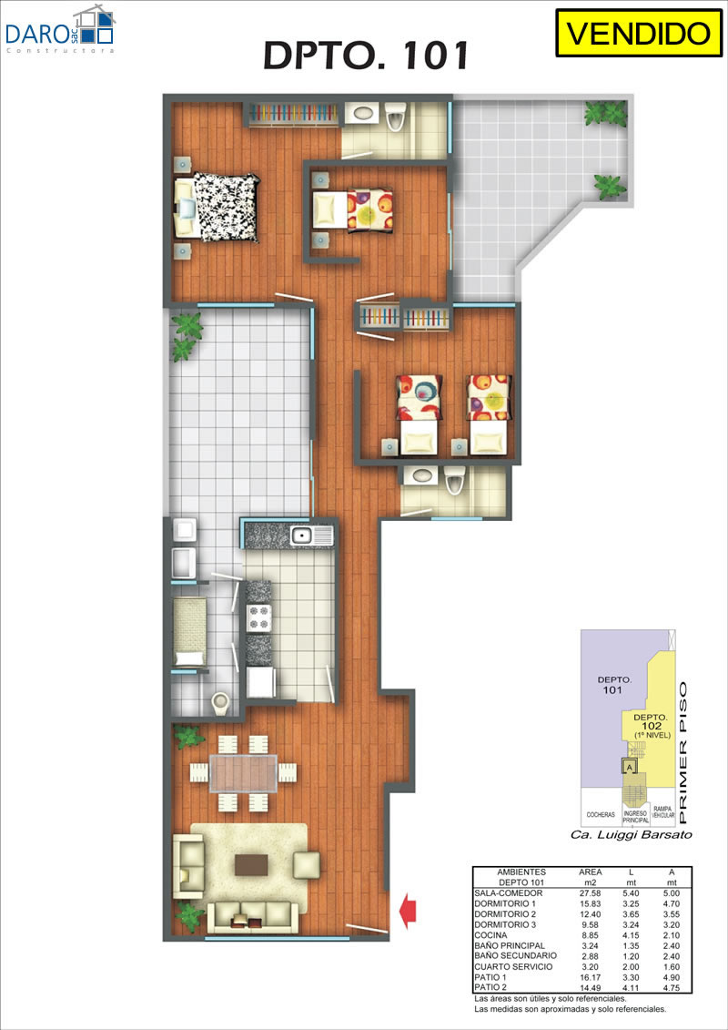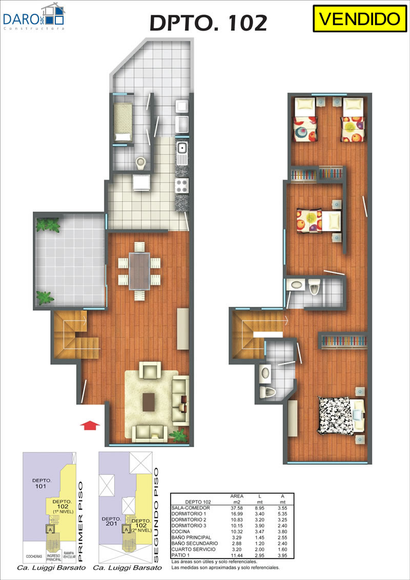 Departamento 102 del primer piso con 128.77 m2 de área techada (63.00 m2 en el primer nivel y 65.77 m2 en el segundo nivel) y 18.36 m2 de área libre, con dos niveles. El primer nivel consiste en sala-comedor con escalera, patio, cocina, patio-lavandería, cuarto de servicio, baño de servicio y el segundo nivel consiste en hall, baño secundario, 3 dormitorios, baño principal incluido en el dormitorio principal.
