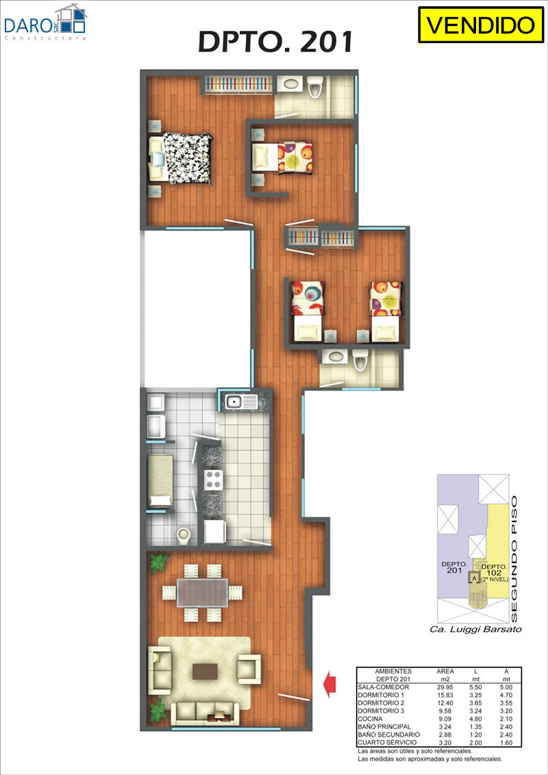 Departamento 201 del segundo piso con 116.58 m2. Consiste en sala-comedor, cocina, patio-lavandería, cuarto de servicio, baño de servicio, baño secundario, hall, 3 dormitorios, baño principal incluido en el dormitorio principal.