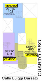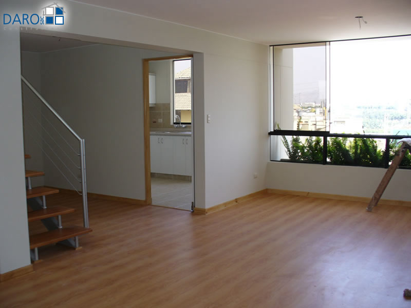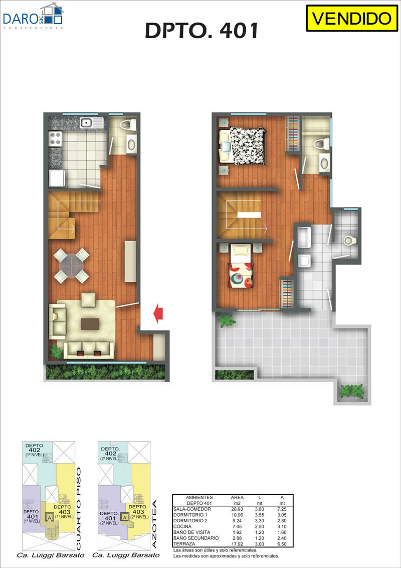 Departamento 401 del cuarto piso con 92.06 m2 de área techada (45.34 m2 en el primer nivel y 46.72 m2 en el segundo nivel) y 19.99 m2 de área libre, con dos niveles. El primer nivel consiste en sala-comedor con escalera, cocina, baño de visita y el segundo nivel consiste en hall, 2 dormitorios, baño secundario, terraza, patio-lavandería, baño de servicio.