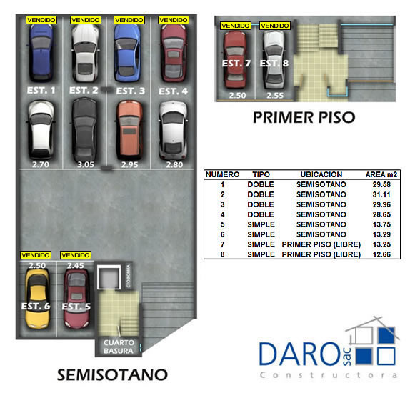 En el primer piso se tienen dos estacionamientos simples. El semisótano consta de dos estacionamientos simples y cuatro estacionamientos dobles.