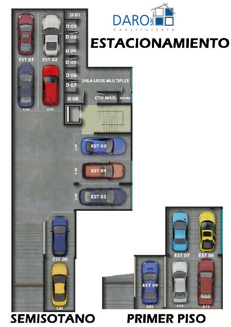 En el primer piso se tienen dos estacionamientos simples. El semisótano consta de dos estacionamientos simples y cuatro estacionamientos dobles.