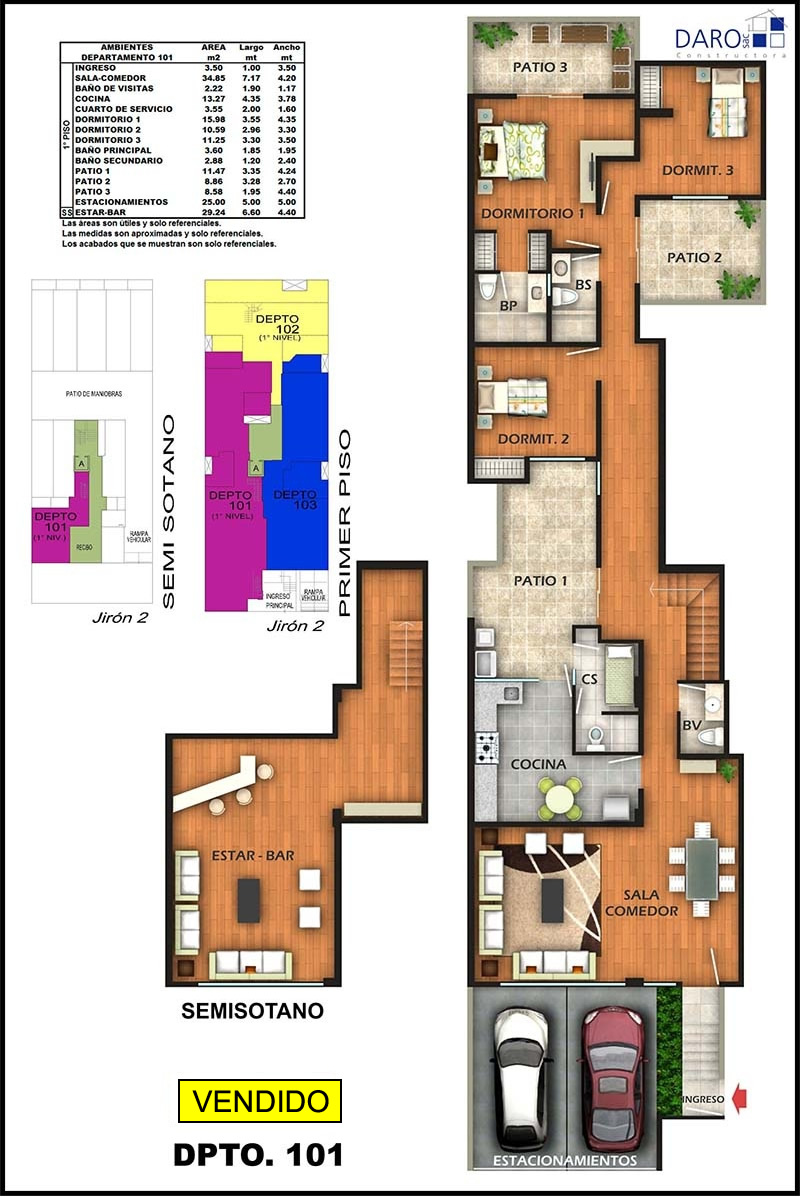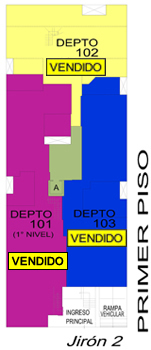 Departamento 101 del primer piso con 192.38 m2 de área techada (145.65 m2 en el primer nivel y 46.73 m2 en el segundo nivel) y 62.29 m2 de área libre (de ahí 25.00 m2 le corresponden a los estacionamientos), ocupa dos niveles. El primer nivel consiste en ingreso Independiente, recibo, sala-comedor, baño de visita, cocina, patio-lavandería, cuarto y baño de servicio, 3 dormitorios, baño principal incorporado en el dormitorio principal, baño secundario, 3 patios interiores, dos estacionamientos simples con ingreso vehicular directo, escalera de acceso al nivel inferior y el segundo nivel consiste en hall, estar-bar.