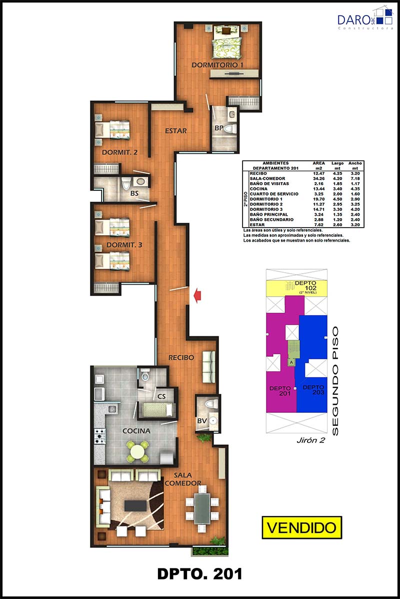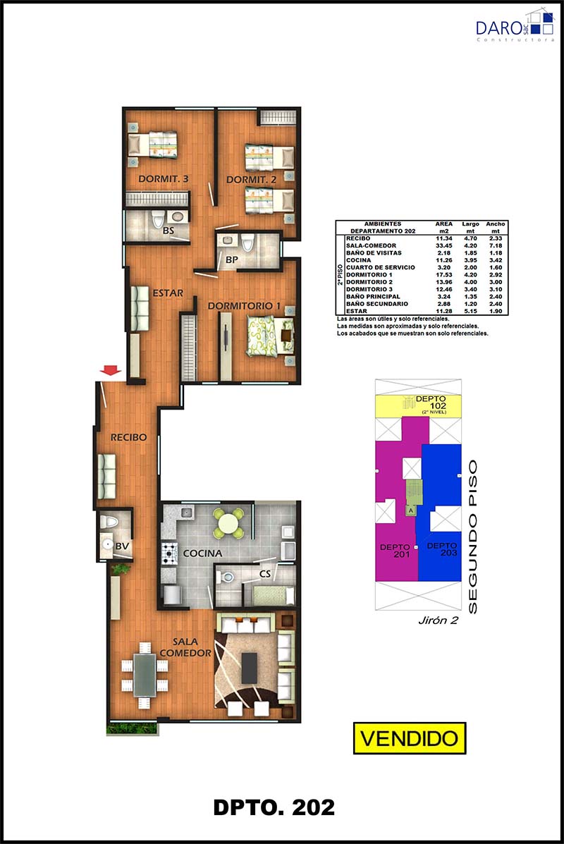 Departamento 202 del segundo piso con 149.97 m2 de área techada. Consiste en recibo, sala-comedor, baño de visita, cocina, patio-lavandería, cuarto y baño de servicio, 3 dormitorios, baño principal incorporado en el dormitorio principal, baño secundario, estar.