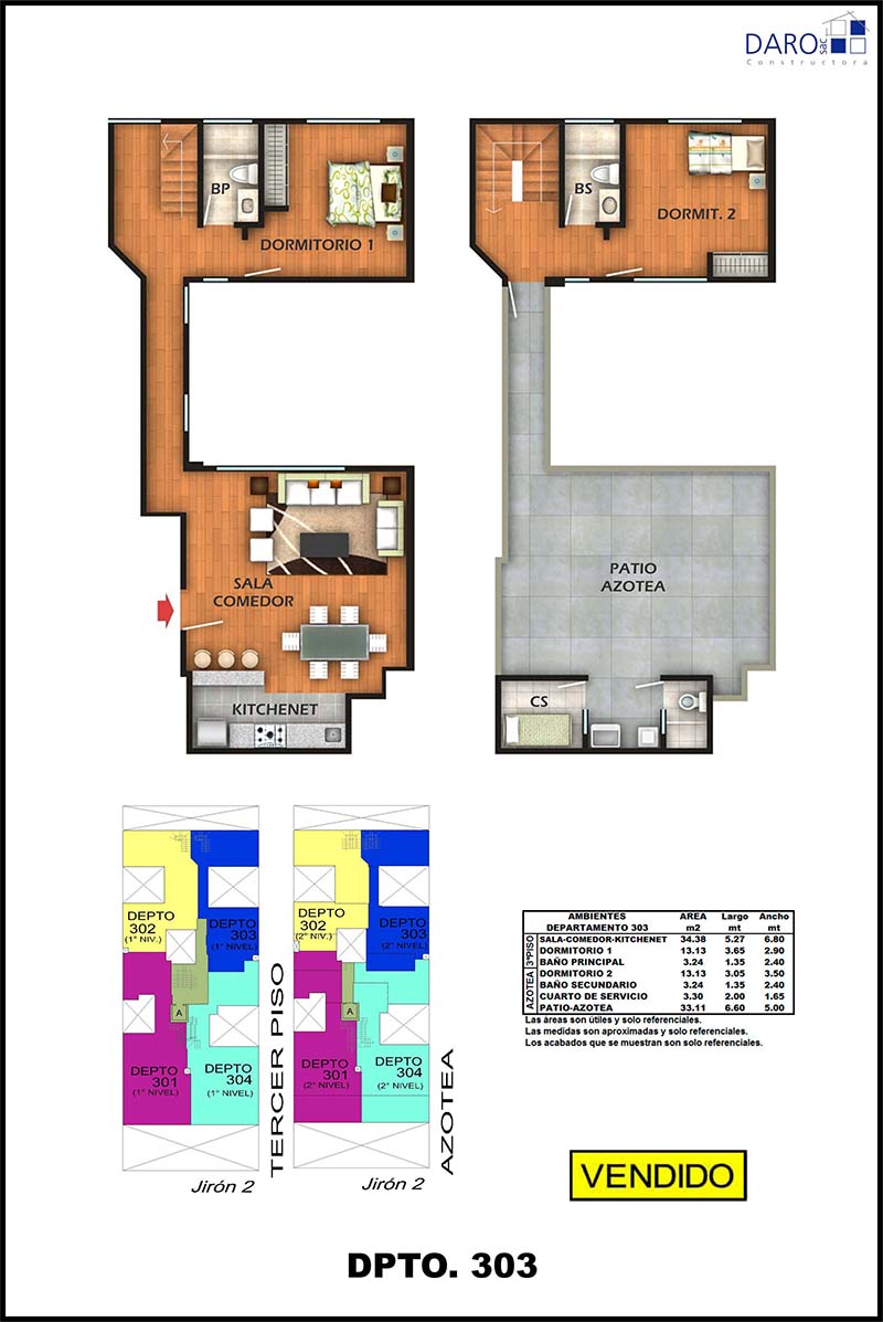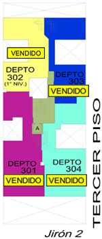 Departamento 303 del tercer piso con 112.48 m2 de área techada (72.78 m2 en el primer nivel y 39.70 m2 en el segundo nivel) y 40.28 m2 de área libre, ocupa dos niveles. El primer nivel consiste en sala-comedor, kitchenette, hall, 1 dormitorio, baño secundario, escalera de acceso al segundo nivel y el segundo nivel consiste en 1 dormitorio, baño secundario, patio-lavandería, cuarto y baño de servicio, patio-azotea.