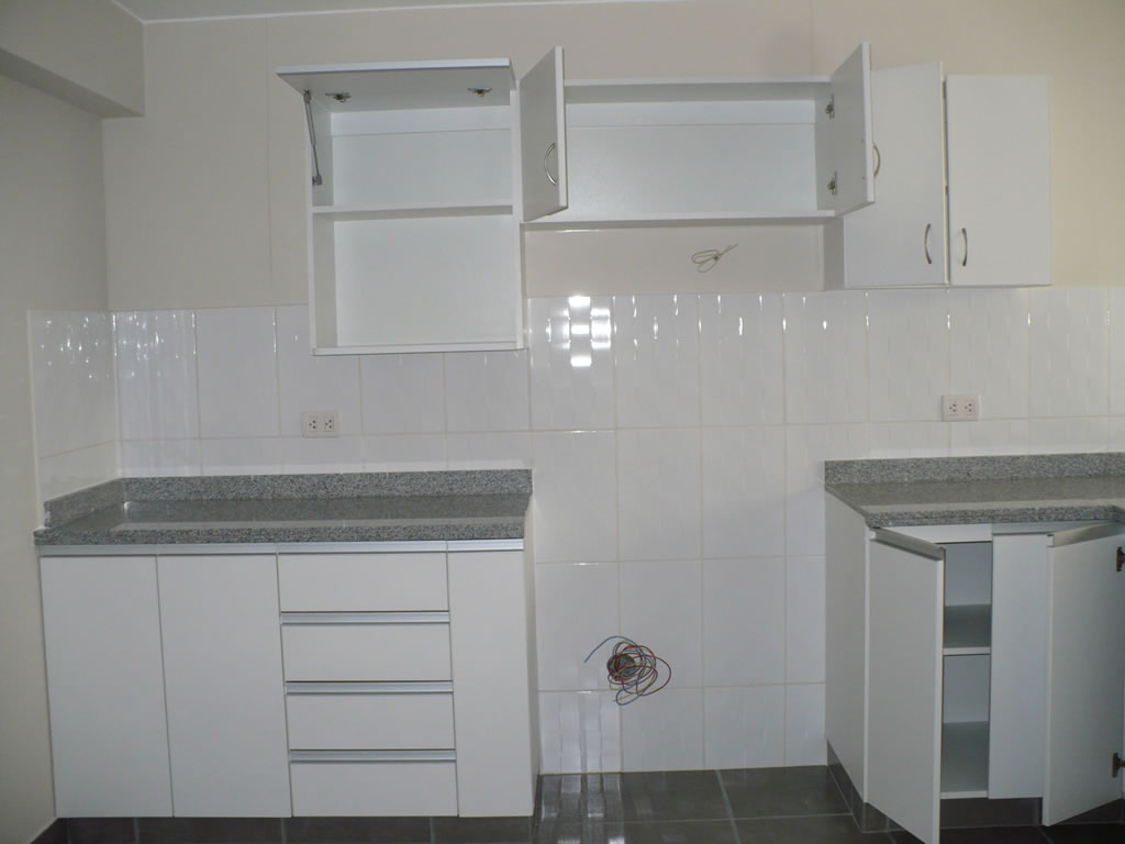 Muebles de cocina en melamina diseñados con muebles altos y bajos.